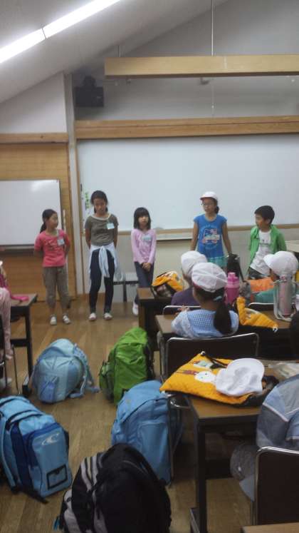 研修室に入って,紫明小学校といっしょに自己紹介をしています。雨が降ってきたので,昼食のお弁当も,この研修室で食べる予定です。