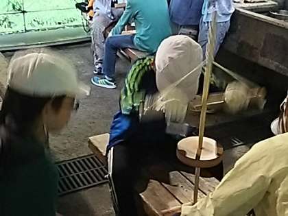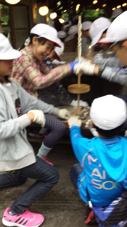 火おこしの体験もしています。今は,マッチやライターで簡単に火をつけることができますが,昔の人の苦労を知る上で,とても貴重な体験です。苦労しておこした火は,ランタンに入れて,野外炊事などのときに使う予定です。