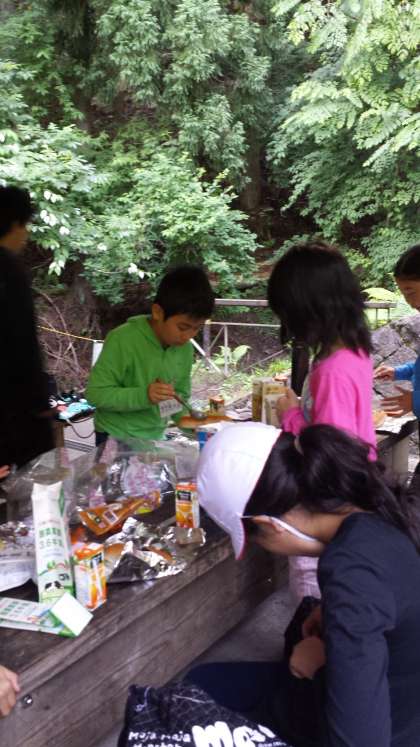 朝は,パックドッグの朝食です。みんな協力して調理し,おいしいホットドッグをいただくことができました。