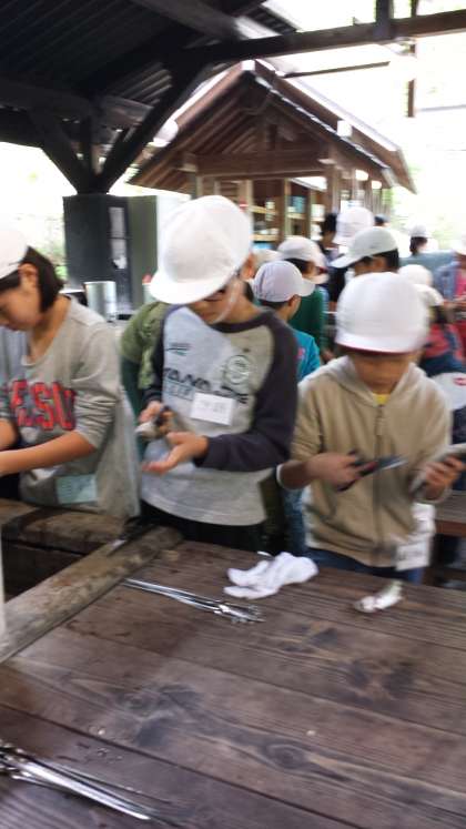 魚つかみの後は,魚さばきです。とった魚の内臓を取り出して,焼き魚にして食べる予定です。