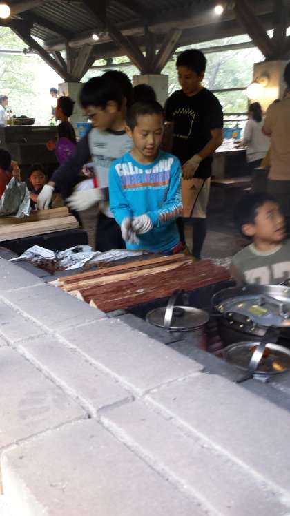 今日は3食とも野外炊事で食事を作ります。晩御飯のカレーを作り始めました。かまどに火が入り,いよいよ炊き込みが始まります。