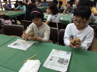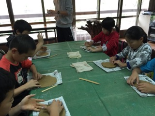 午前中,粘土を使った「花背焼き」を体験しています。匠の方からやり方を聞いて,体験開始です。