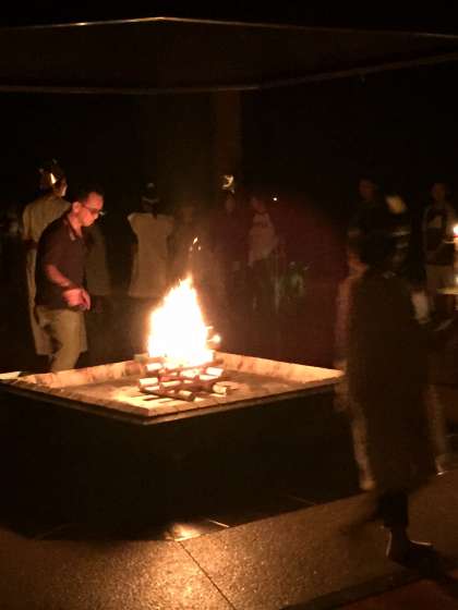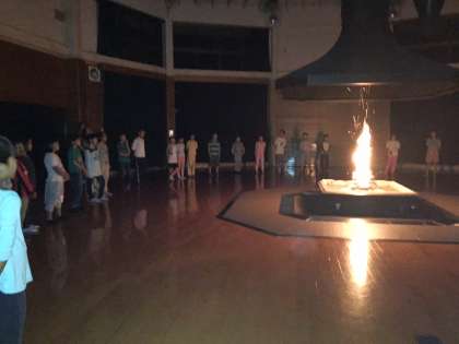 夜のキャンプファイヤーは,紫明小学校と合同でプレイホールで行いました。屋内ながら,外と同じようにファイヤーができ,子どもたちも喜んでいました。火の神から炎をもらい,点火して幻想的な火の明かりのもとで,歌や踊り,ゲームなどを楽しみました。