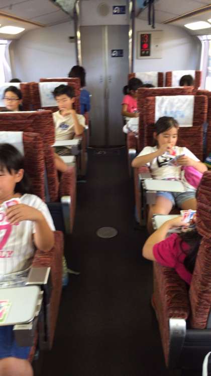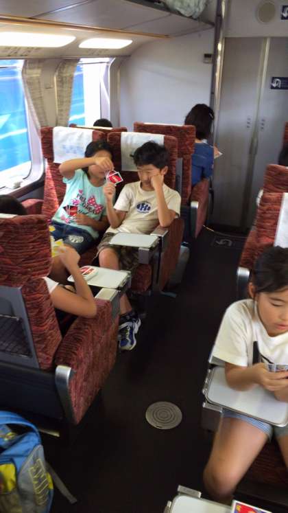 帰りの電車の中の様子です。子どもたちは,トランプなどに興じています。たくさんの思い出を残して,京都に向かっています。