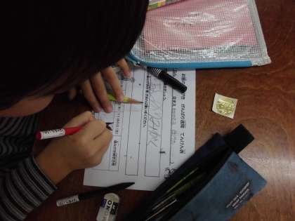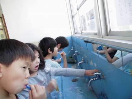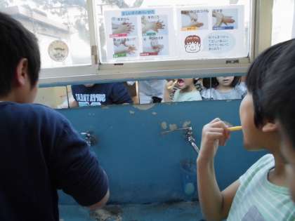 今日の歯みがき検定は1年生です。みんな染め出しのイメージはできていたようで,次々と大きなお口をあけて奥歯を染めだして,歯みがきをスタートさせています。「上の歯は見えないよ〜!」と鏡で一生懸命上の奥歯がきれいになっているかを確かめています。合格をもらって「やったー!」と大喜び。歯みがきカードに,今日の歯みがきをした印をていねいにつけています。はえてきた6歳臼歯をむし歯にしないためにも,今日のように毎日ていねいに奥歯までみがいてほしいと思います。