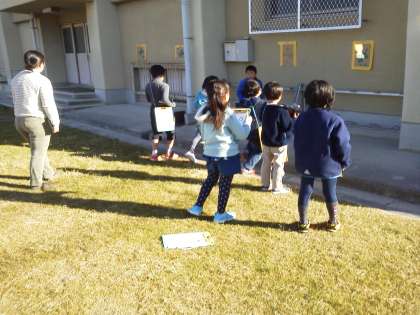 3年生の理科の授業で運動場に出て鏡を使って光集めをしました。温度計に向かって集めた光を当てて,光が当たっている時と,当たっていない時の温度のちがいを調べました。
