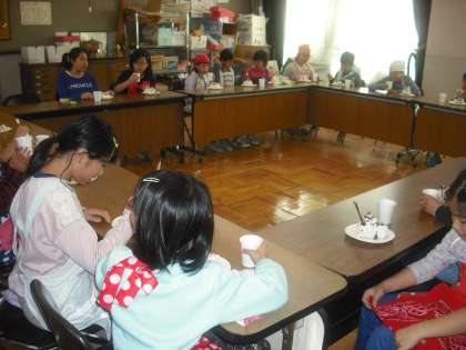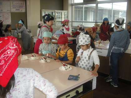 「ふれあいクッキング」は,ケーキの生地の上に生クリームやイチゴ,チョコレートなどを飾り付けておいしそうなデコレーションケーキに仕上げて食べていました。