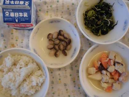 今日の給食には,トラの模様に似ている「とら豆」を使って