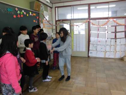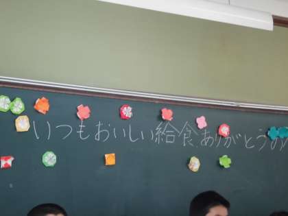今週は給食週間です。今日は勝山給食調理員さんと河合先生にお越しいただき,「いつもおいしい給食ありがとうの会」を行いました。給食の大好きな子どもたちから歌と感謝の気持ちのメッセージをプレゼントしました。