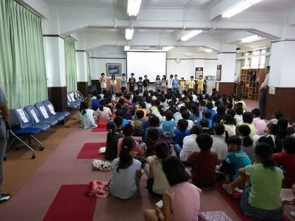 全体ミーティングをやっています。今日は,桂川小学校・二ノ丸北小学校と一緒に行動するので,お互い紹介し合っています。