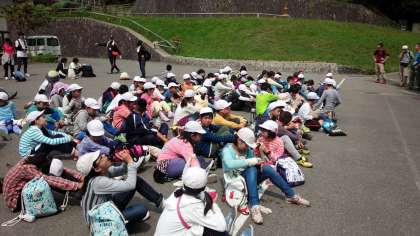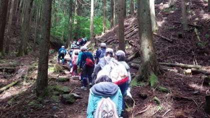 山登りのスタートです。かなりの急斜面を登っています。あたりは,うっそうとした森林です。頂上はどこなのでしょうか