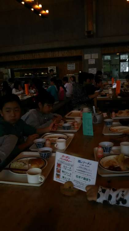 朝食を食べています。何回も食べた山の家の食事も今日の昼食が最後です。