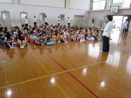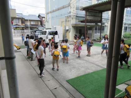 5校時に風水害の避難訓練がありました。京都・亀岡地方に暴風警報が出たという想定で,町別ごとに集団下校をするという想定で行いました。みんなスムーズに集合して町別に並び替えて下校することができました。