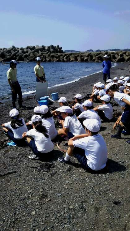 近くの宮崎浜に磯観察にやってきました。きらめく海を前に子どもたちの気持ちもたかぶっています。所員の方や先生から聞いた注意をしっかり守って磯観察をしてほしいと思います。