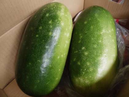 とうがんは夏にたくさんとれますが,かたい皮に包まれていて冬まで保存できるので「冬瓜」と名前が付けられました。今日は1つ3kg程の大きな冬瓜が2つ届きました。だしがよくしみ込んでいて,子どもたちは大好きなようです。