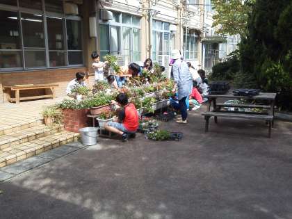 10/12の創立80周年式典に向けて準備も進んでいます。今日は,玄関前のプランターの植え替えをしました。夏の草花が枯れかけてきたこの時期,新しい苗を植えかえて玄関前がより華やかになりました。