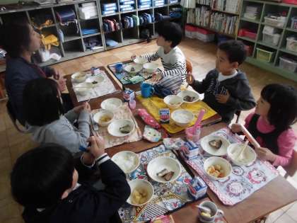 今日の関東煮は,ちくわ,うずら卵,じゃがいも,にんじん,だいこん,こんにゃくをだしで煮込みました。うずら卵が入っていて喜んでいる子どもたちがたくさんいました。
