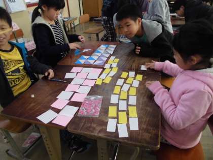長方形や正方形,直角三角形の形の色紙を使って色々な形をつくりました。初めは一人でそれぞれの形を作り,最後はグループでたくさんの色紙を使って,大きな長方形や正方形,直角三角形を作りました。グループで協力して,どこにおけばいいのか話し合い,いろいろな形を作ることができました。