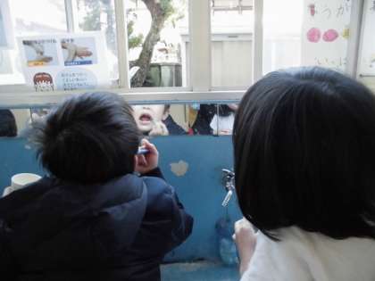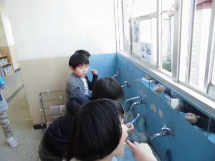 今日は1年生の歯みがき検定です。小学校に入って初めての染め出しに「なに味?」「なにそれ?なにそれ?」と不安と好奇心が入り混じります。奥歯が赤く染まり,みんな一生懸命みがいていました。「初めは赤いのがとれなかったけれど,みがいていったらだんだんとれてきた!」と報告してくれました。いつもの歯みがきも同じくらい時間をかけてみがいてね。