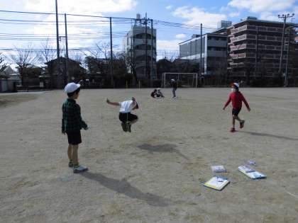 体育の時間に,なわとびをしました。まず一人で練習した後で二人組になってお互いに何回できるか見せ合いをしました。練習をしていく内に,一回ずつ跳ぶ回数が増えていました。休み時間にも,最高記録を目指して練習しています。
