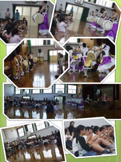 保護者の方の御厚意で「和楽団 ジャパンマーベラス」の方々の演奏を鑑賞しました。和太鼓と言っても色々な種類があり、それらに篠笛が加わる演奏でした。とても迫力がある演奏で、音だけでなく細かい振動が伝わってきます。曲によっては目の前(その距離1M)で演奏します。