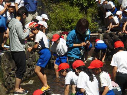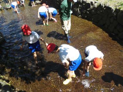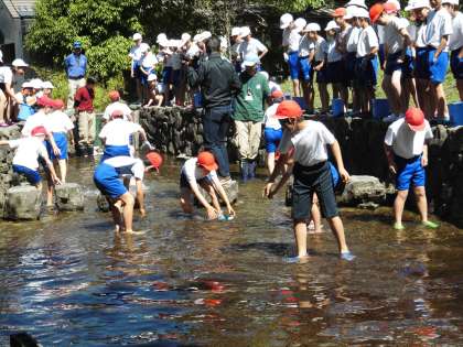 今日の活動の1番目は「魚つかみ」です。池に放たれた魚を追いかけてつかまえようとしますが,魚も必死です。なかなかつかまりません。いよいよ”知恵比べ”になりました。