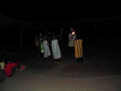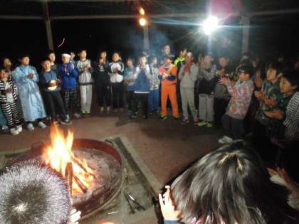 長期宿泊ラストの夜はキャンプファイヤー!厳粛な点火式に始まり,各クラスの工夫を凝らした出し物やゲーム,マイムマイムなどで大いに盛り上がりました。炎を囲んでの楽しい時間は,きっと全員の心に素晴らしい思い出として残ることでしょう。