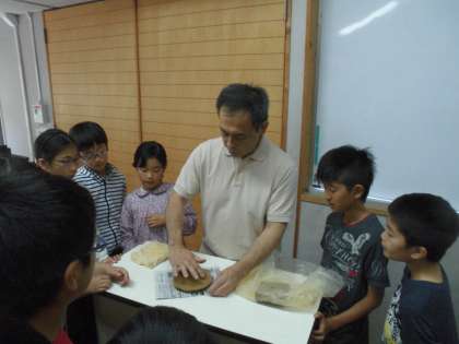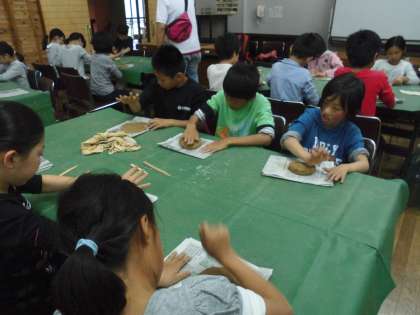 荷物整理や掃除・朝食の後,山の家での最後の活動となる『花脊焼づくり』に挑戦しました。師匠から説明を受けた各班の“ミニ師匠”が伝授し,「15分1本勝負」で作品を作り上げました。