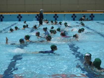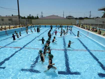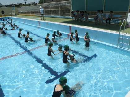 1年生がプールで学習していました。低水位での水慣れ・水遊びということで,ワニになったりカエルになったり・・・普段生活している陸の上とは違った感覚を体で感じ,とても楽しそうに活動していました。