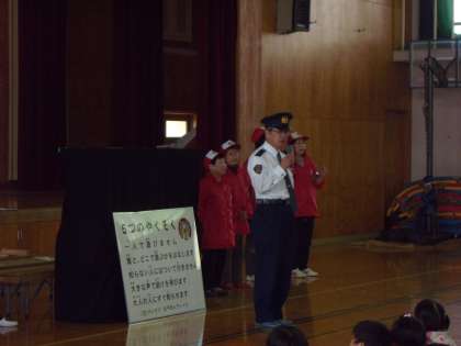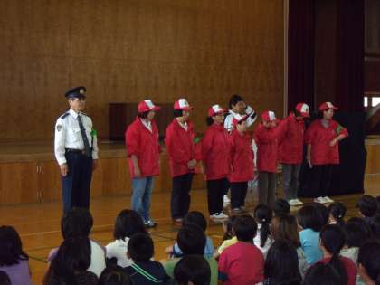 今日は3校時に不審者が侵入したという想定で,防犯訓練をしました。そして,体育館で平安レディースの方と北警察署の方のお話を聞きました。5校時には,町別に集団下校をし,110番の家にあいさつによりました。