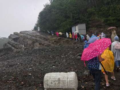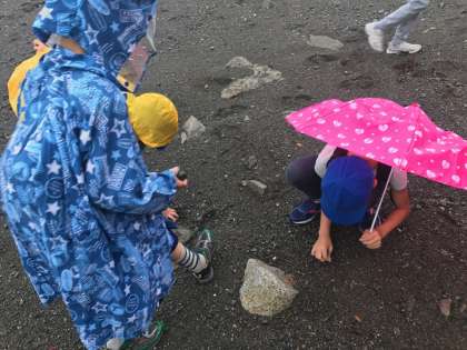入所式の後,宮崎浜へ石拾いに向かいました。途中で雨が降ってきました。今日は天候の為,予定を少し変更しています。