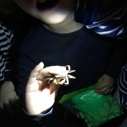 残念ながら雨が降っているので,ナイトハイクの代わりに,みんなで夜の散歩に出ました。懐中電灯を消して静かにすると,自然の音に包まれます。帰りに蟹を見つけました。
