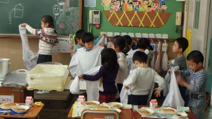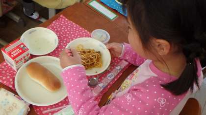 配膳が終わったら,エプロンをきれいにたたみます。給食当番さんありがとう。ご苦労様でした。今日のメニューは,小型コッペパン,スパゲティのミートソース煮,ほうれん草のソテー,りんごゼリーでした。「おいしい!」初めての給食を口にした子どもたちからは,キラキラ笑顔があふれていました。
