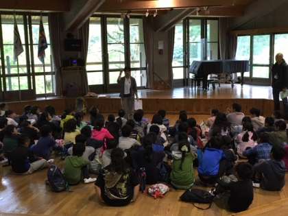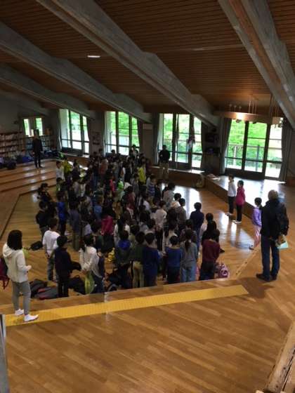 予定通り無事山の家に到着しました。小雨が降っているため,オリエンテーションホールで入所式を行いました。今日のめあては「仲間」です。教室だけでは見つけられない「仲間」のいいところをいっぱい見つけて欲しいと思います。