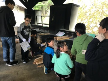 小雨もあがり,少し空が明るくなってきました。子どもたちは野外炊事場へ移動し,カレー作りの準備を始めています。調理班は,野菜を切ります。ニンジン・玉ねぎ・ジャガイモとなかなかうまいものです。一方のかまど班は,余裕に見えますが…これも作戦です。あまり早くに火をつけてしまうとカレーを煮込むまでに火が燃えきってしまうおそれがあるからです。調理班とかまど班のチームワークが試されます!