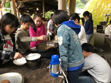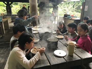 カレーのルーをお鍋に入れると,スパイシーな香りが広がり,ゴクリッ…食欲をそそられます。何よりも仲間と協力して作る中で「友情」という調味料が加わったことで,カレーをよりいっそうおいしくさせたのでしょう。どのグループもとても上手にできました。ごちそうさまでした♪