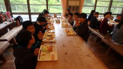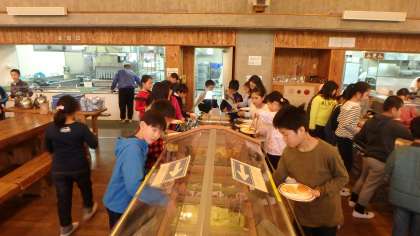 昨日の夕食は,5時ごろに食べたので,子どもたちのお腹はペコペコだったようです。パンにする?ごはんにする?えっ…両方?!バイキングコーナーには行列ができていました。ごちそうさまでした!