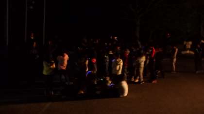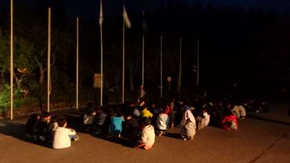 すっかり夜がおとずれ,山の家の景色を変えていきました。いよいよナイトハイクへ出発です。昼間とは違った自然の雰囲気を五感を使って味わうことがめあてです。先生から気分アゲアゲの腕輪をプレゼントされ,うれしそうな子どもたち。気をつけて,行ってらっしゃい!