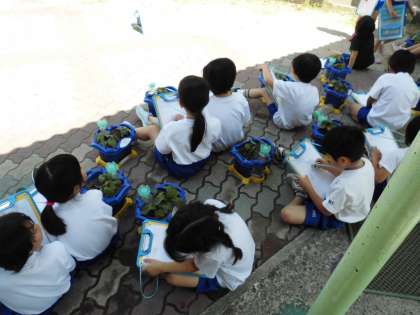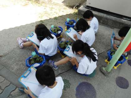 春に植えたあさがおの種から芽が出て,随分と大きく育ってきました。今日はそれぞれのあさがおをじっくり観察して,スケッチしたり気付いたことをメモしたりしました。子ども達は「葉っぱがざらららしてる!」「よく見ると毛が生えてる!」などと声を上げていました。夏にはどんな花が咲くのでしょう。