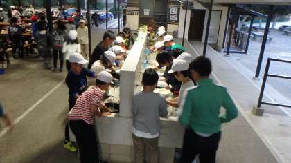 さて,気がつけば辺りが暗くなってきました。長袖がちょうどいいくらいの気温でしたが,夜はもう少し冷えるかもしれません。この後,入浴後も野外での活動ナイトハイクがありますので,服装の声かけをするなど体調管理には十分注意していきたいと思います。