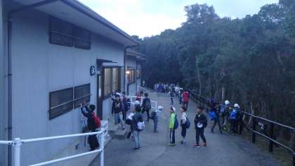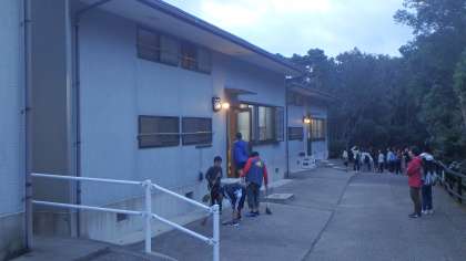 2日目の朝をむかえました。昨夜は思ったよりも早くに子どもたちは夢の中へ,その分朝は早起きでした。6時起床を待たずに,寝具を整理して男女が90畳とバンガローの引っ越し作業にとりかかりました。中には,門はき清掃をしている子も!気持ちのいい朝です♪今日もいい1日になりますように☆