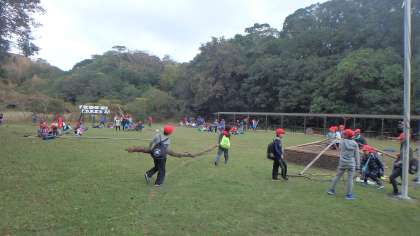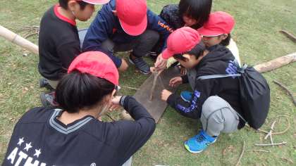 どこから見つけてきたのでしょう?自分の身長よりもずいぶん大きな木を運んで来たり,小枝やドングリを集めたり,発想をいかした造形遊びを行いました。役割分担をするなどチームワークのよさが作品のできにも影響していたように思います。子どもたちの豊かなアイデアに感心させられました♪