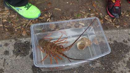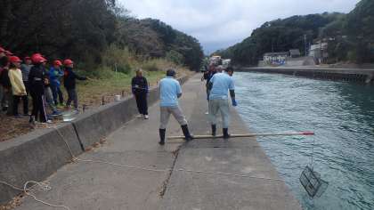 昨日仕かけたカゴを引きあげる時がやってきました。1グループずつ子どもたちが力を合わせて引っ張ります。手ごたえは?ドキドキします。最初は,大量のゴンズイ(毒のある魚)に落胆させられましたが,ガシラやグレ,ヤドカリ,ヒトデといろんな生き物をゲットすることができました!中でも一番のヒットは,伊勢海老です!!!本当に獲れました♪職員さんも驚きの大収獲!見事なジャンプでケースから跳び出すなど,とれとれピチピチです!みんなヤッタね!おめでとう☆