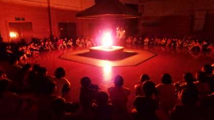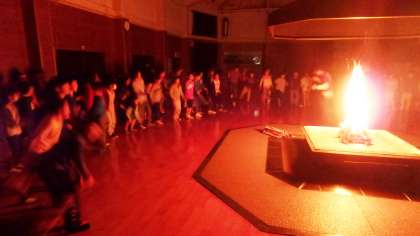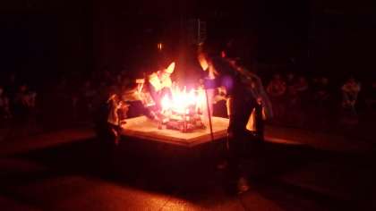 真っ暗なプレイホールに火の神と火の子が降臨し,火を授けてくださいました。神秘的なムードの中,静かにキャンプファイヤーが始まりました。でも,激しく燃え上がる炎のように,子どもたちのボルテージも一瞬でMAXに!!