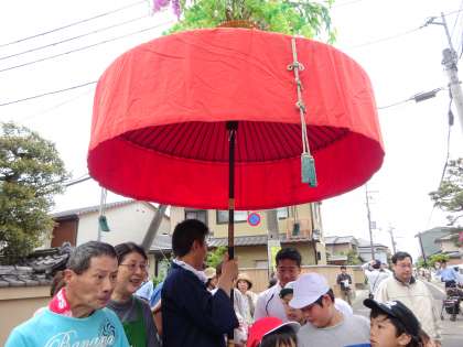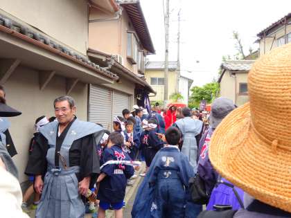 5月15日は上賀茂校区のやすらい祭りの日。みんなで大田神社周辺まで歩いて行きました。法被を着た大人の人や小学生が横笛を吹いたり踊りを踊ったりしていました。