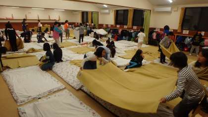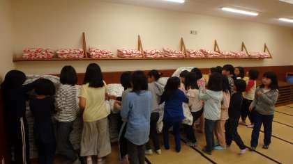 ふりかえりに使用するため女子の寝具準備は一番最後になります。90畳は文字通り,畳90枚の広さの部屋です。まずはじめに一人畳一枚になるように,寝転がってシミュレーション♪それからなかまと協力して手際よく寝具準備を進めていました。さきほどの反省がすぐにいかされており,大変微笑ましかったです。おやすみなさい☆