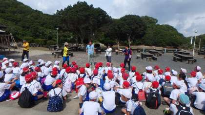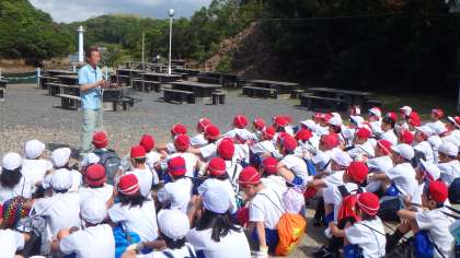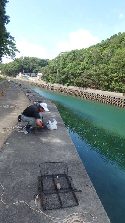 英虞湾と太平洋とを結ぶ深谷水道にかごを仕掛けます。所員さんが18このかごの仕掛けを作ってくださり,子どもたちは説明を聞きました。その後,各担任がジャンケンしてどの位置にかごを投げるかを決めました。