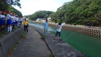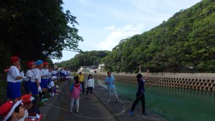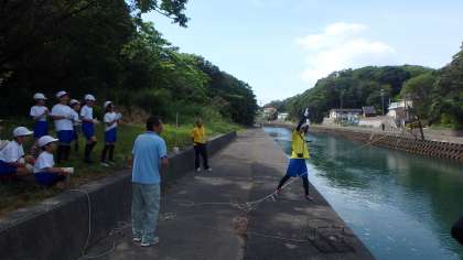 担任の手でかごが投げ入れられました。4組が太平洋側,2組が英虞湾側,3組がその真ん中と,ジャンケンで決めた位置がどう出るか?引き上げが楽しみです♪