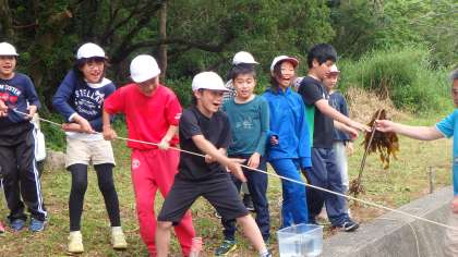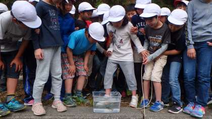 朝に仕掛けたかごを引き上げる時間がきました。ドキドキしているのは子どもばかりではありません。もしかしたら担任が一番責任を感じてハラハラしているかも?