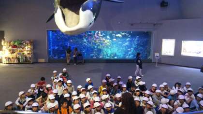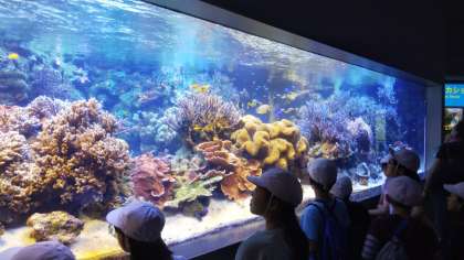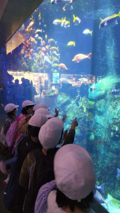 鳥羽水族館にやって来ました。グループごとに自由散策をします。まずは、エントランスの巨大水槽に魅了されている模様です。ニモとドリーを見つけて盛り上がっています。
